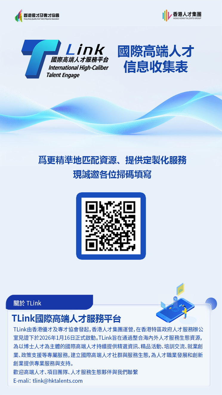 TLink國際高端人才服務平台,在香港特區政府人才服務辦公室的大力支持下,由香港優才及專才協會發起、香港人才集團運營,於2026年1月16日成立。